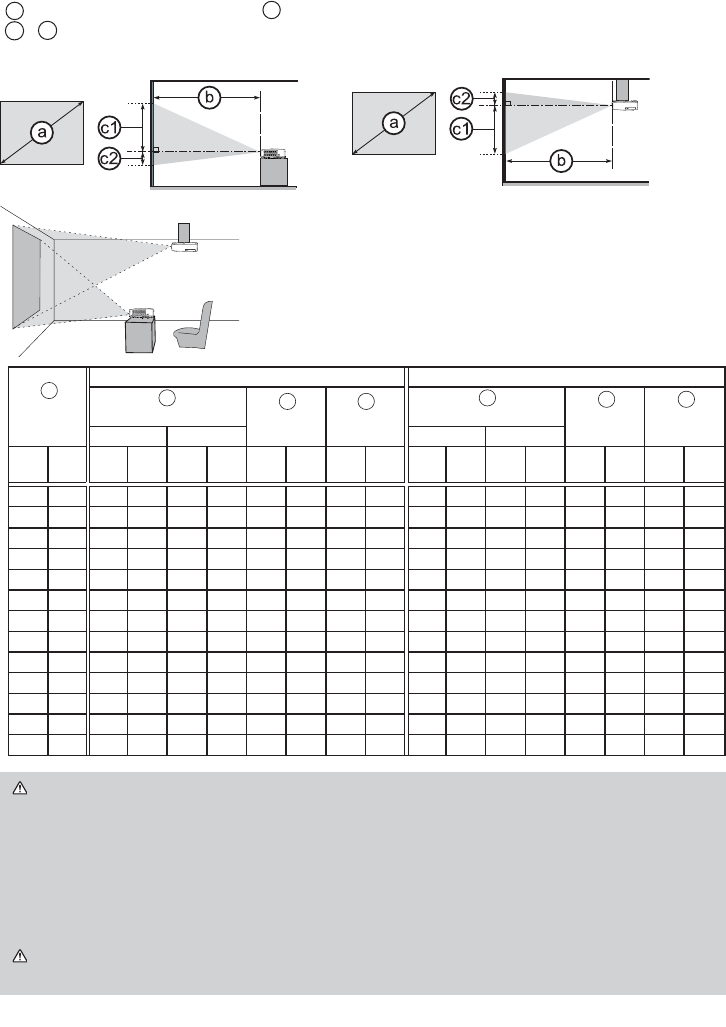 Refer to the illustrations and tables below to determine screen size and projection distance.